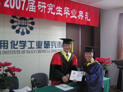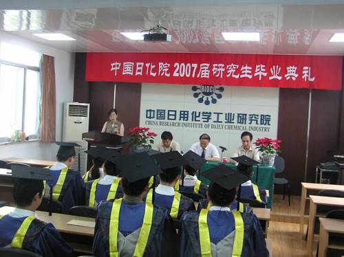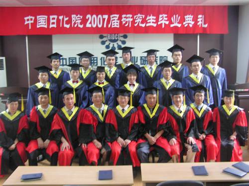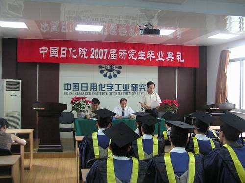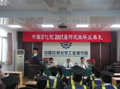 7月6日下午,我院舉行 “2007屆研究生畢業(yè)典禮暨學位授予儀式”,儀式由黨委副書記郭建國同志主持。王萬緒院長、黨委書記代表院黨政班子及全院職工向圓滿完成學業(yè)、順利畢業(yè)的13位研究生表示熱烈的祝賀,并向辛勤工作的各位導師表示感謝。李秋小副院長宣讀了《關(guān)于公布中國日化院2007年碩士研究生優(yōu)秀論文的通知》、《關(guān)于公布張高勇院士獎勵基金獲獎名單的通知》。王萬緒院長向獲得張高勇院士獎勵基金的李遵峰、李國印、張靖峰三位同學和他們的指導教師支建平教授高工、杜志平教授高工頒發(fā)了獎勵證書。隨后李秋小副院長宣讀了《關(guān)于授予張靖峰等十三位同學工學碩士學位的決定》,王萬緒院長親自為身著碩士服的研究生逐一授予了工學碩士學位并頒發(fā)了證書。杜志平教授高工代表全體導師向全體學生們提出殷切希望,畢業(yè)生代表張靖峰同學發(fā)言感謝我院各位導師、領(lǐng)導、廣大員工三年來給予他們的關(guān)心和幫助。儀式結(jié)束后,導師和全體畢業(yè)生在熱烈的氣氛中一起合影留念。