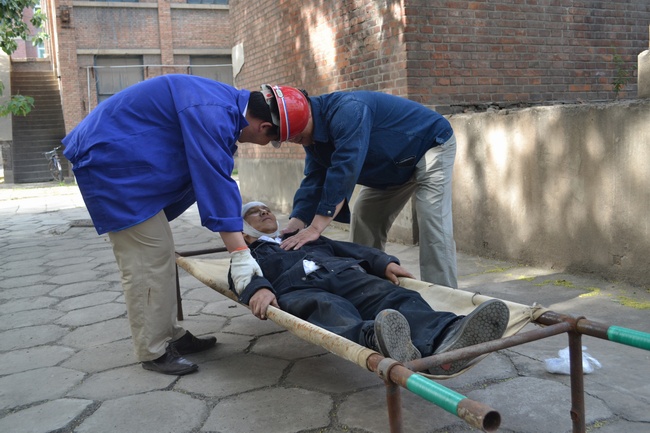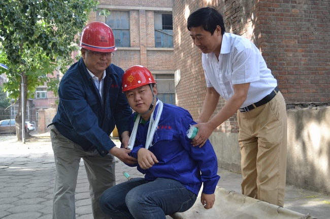 本次消防應(yīng)急預(yù)案演練分為模擬火災(zāi)和器材操作兩部分。上午9時,伴隨著一聲“不好,車間著火了”,模擬火災(zāi)演練拉開了序幕。只見車間有濃煙冒出,車間班組負(fù)責(zé)人立即一邊向預(yù)案應(yīng)急領(lǐng)導(dǎo)組報告,一邊按預(yù)案要求開展疏散、救護(hù)、初期火情控制和滅火等工作。很快,院應(yīng)急領(lǐng)導(dǎo)組帶領(lǐng)救護(hù)組、滅火組等到達(dá)現(xiàn)場,并立即加入現(xiàn)場救護(hù)和滅火等工作,同時組織職工有序通過車間通道到達(dá)安全地帶?!笆軅比藛T被迅速撤離到安全地帶,并進(jìn)行積極的救護(hù)。火源也被迅速撲滅。