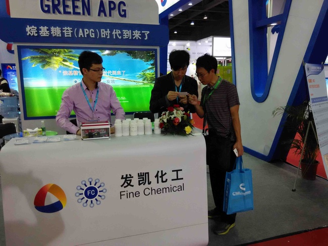 作為國內(nèi)規(guī)模最大、品種最優(yōu)的APG制造商,上海發(fā)凱“綠色 環(huán)保 安全”的品牌形象贏得了與會來賓的一致認可。近年來,企業(yè)致力于充分發(fā)揮技術(shù)優(yōu)勢,不斷加強產(chǎn)品研發(fā),擴大應(yīng)用領(lǐng)域,以其高“性價比”優(yōu)勢,逐步提升國內(nèi)外市場占有率。而中輕日化作為國內(nèi)最大的新型非離子表面活性劑產(chǎn)業(yè)化示范基地參加此次展會,公司發(fā)展和新產(chǎn)品推廣也備受業(yè)界關(guān)注。企業(yè)展臺背景重點突出了公司主打新產(chǎn)品——脂肪酸甲酯乙氧基化物(FMEE)和改性油脂乙氧基化物(SOE),吸引了眾多國內(nèi)外賓客駐足關(guān)注、了解。