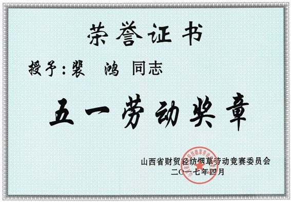山西省財貿(mào)輕紡煙草勞動競賽委員會在2017年“五?一國際勞動節(jié)”期間,對山西省財貿(mào)輕紡煙草行業(yè)在2016年度涌現(xiàn)出的一批貢獻(xiàn)突出的先進(jìn)集體和先進(jìn)個人進(jìn)行了表彰。本次表彰共授予23個先進(jìn)單位“五?一勞動獎狀”榮譽(yù)稱號,22個先進(jìn)集體“工人先鋒號”榮譽(yù)稱號,70名同志“五?一勞動獎?wù)隆睒s譽(yù)稱號。